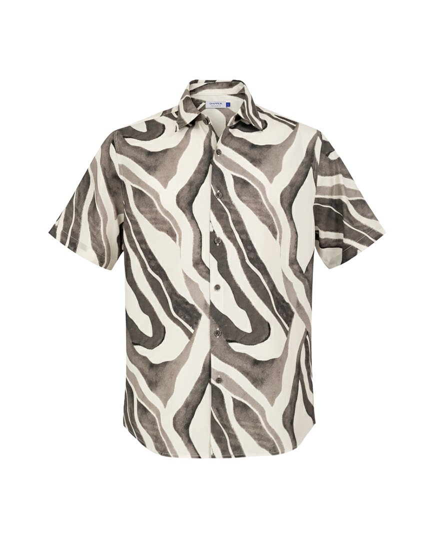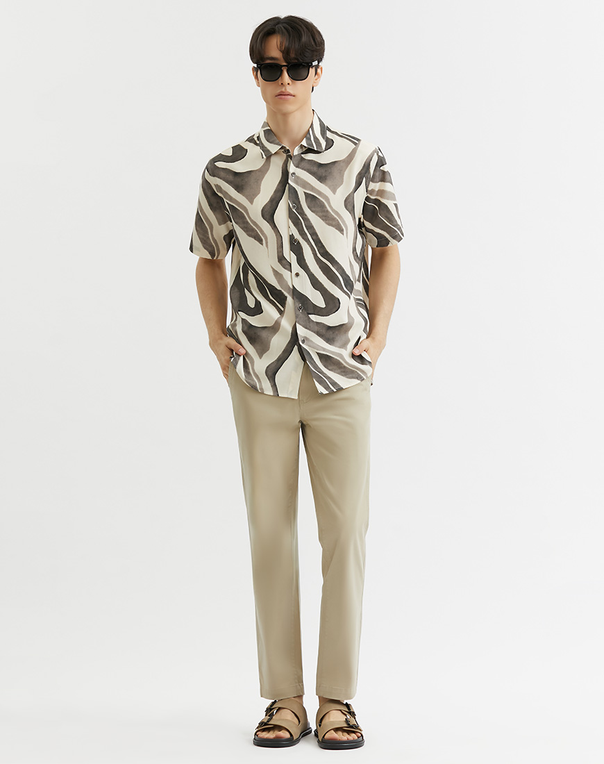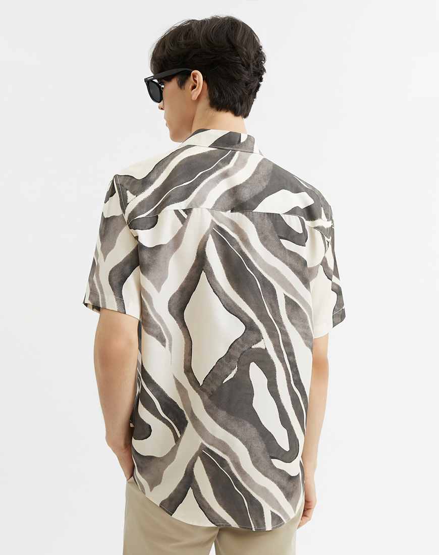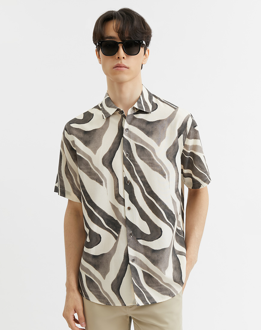 เสื้อเชิ้ตแขนสั้น ทรง Regular-Fit แบบมาตรฐาน ไม่เข้ารูป เนื้อผ้าเทนเซลผสมลินิน ผิวสัมผัสนุ่ม น้ำหนักเบา เย็นสบาย ระบายอากาศได้ดี โดดเด่นด้วยลายพิมพ์ ดิจิตอลปริ้นทั้งตัว เป็นลวดลายคลื่น “Liquid Motion” เสื้อเชิ้ตผู้ชายแขนสั้นตัวนี้สามารถใส่ได้หลากหลายโอกาส จับคู่กับกางเกงชิโน่ หรือกางเกงยีนส์ ช่วยทำให้ดูดีมากขึ้น สามารถใส่เป็นชุดลำลองได้ ดูทันสมัย